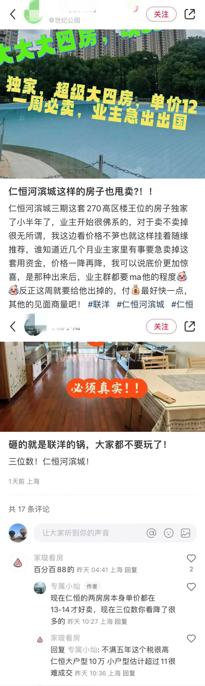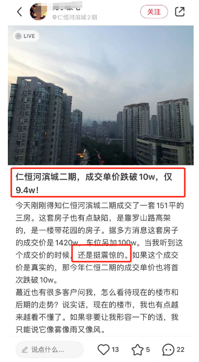 博主听到这一成交价时也表示相当震惊!他说,如果这个成交价是真实的,那么仁恒河滨城二期成交单价首次跌破10万。