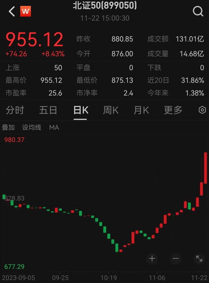 北交所成为A股本周最大亮点之一。在昨日一度大涨超过11%后,北证50指数今日再度上涨8.43%,北交所231只个股中仅2只下跌。截至收盘,北证50指数周涨幅达到16.82%,10月24日以来涨幅累计35.18%。(来源:Wind,截至2023.11.22)