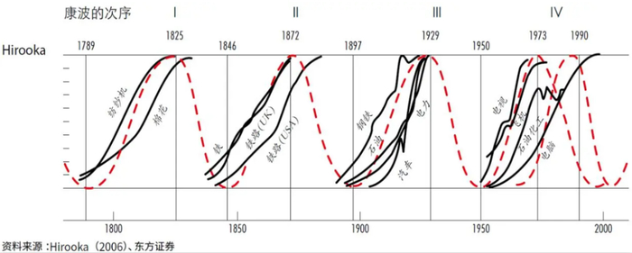 周期是宏观层面影响投资的最重要的力量。经济学家康德拉季耶夫发现在发达商品经济中存在一个很有趣的经济周期,叫做康波周期。它的核心观点认为全世界的资源商品和金融市场价格,会按照50-60年为周期进行波动,一个大波动里面包含了繁荣、衰退、萧条和复苏四个小波。