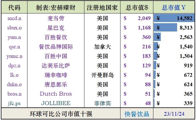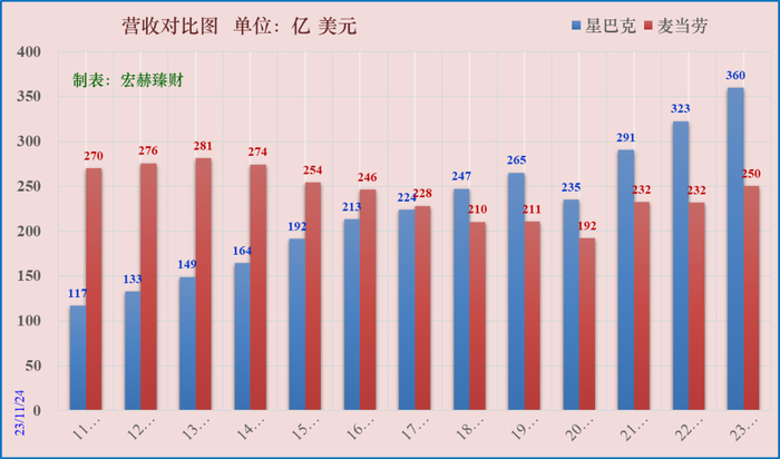当前时点,星巴克以360亿美元的营收,41亿美元的归母净利润,得到了1168亿美元的市值(市盈率28倍);而麦当劳以250亿美元的营收,83亿美元的归母净利润,得到了2049亿美元的市值(市盈率24倍)。