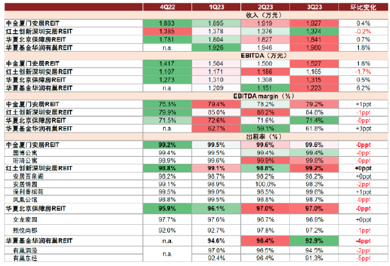 整体来看,四单保租房REITs出租率维持稳健,其中中金厦门安居REIT、红土创新深圳安居REIT及华夏北京保障房REIT三季度末出租率均接近满租;华夏基金华润有巢REIT季末出租率环比下降4ppt至92.9%,主要系季末退租及集中入住带来的正常波动。