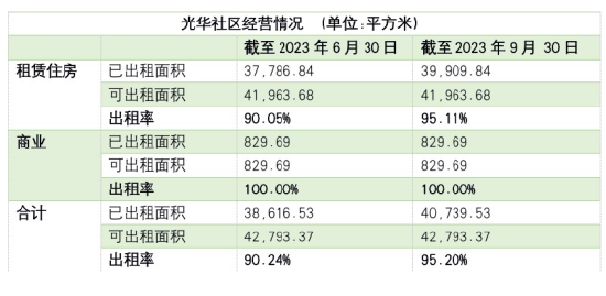 光华社区项目自2023年3月起开始运营,可租赁面积为4.28万平方米,其中租赁住房可租赁面积为4.2万平方米,配套商业面积约829.69平方米。截至2023年9月30日,光华社区租赁住房出租率95.11%,商业出租率100.00%。
