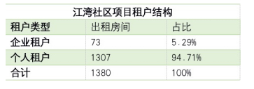 类型以个人租户为主。其中,出租给企业73间,占已出租房间数的5.29%,出租给个人1307间,占已出租房间数的94.71%。个人租户占比较高,企业单一租户租赁集中度较低,因此江湾社区项目的租户具有良好的分散性。