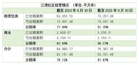 截至2023年9月30日,江湾社区租赁住房出租率91.7%,商业出租率96.07%。