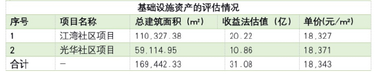 光华社区项目账面原值为8.89亿元,账面净值为8.85亿元,采用收益法评估的评估值为10.86亿元,增值额为2.01亿元,增值率为18.49%。