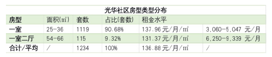 光华社区共有可出租房间1234间,项目户型选择较少,以一室户型为主,一室面积为25-36平方米,共1119间,一室二厅户型为54-66平方米,只有115间。