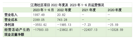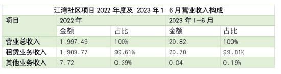 2020-2022及2023上半年,江湾社区项目营业收入分别为0.00万元、0.00万元、20.82万元及1997.49万元,其中2022年及2023年1-6月营业收入以租赁业务收入为主,占营业收入比例分别为99.81%和99.61%。