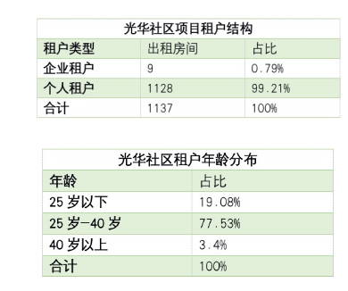 光华社区个人租户占比较高,企业单租户租赁集中度较低,项目租户具有良好的分散性,主要客群为25-40岁的年轻高知群体,支付能力较为稳定。