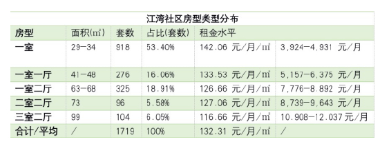 在江湾社区项目1719间租赁房源中,一室户型面积为29-34平方米,共918间;一室一厅户型面积为41-48平方米,共276间;一室二厅户型面积为63-68平方米,共325间;二室二厅户型面积为约73平方米,共96间;三室二厅户型面积约99平方米,共104间。