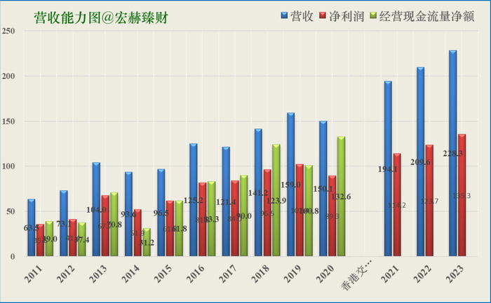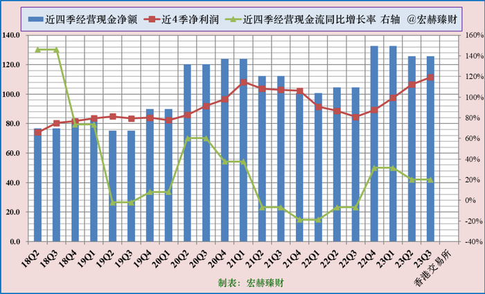 蓝色折线持续在绿色柱图上边及以上,显示净利润含金量高。
