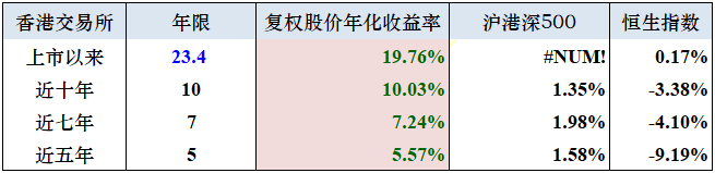 香港交易所 上市以来23.4年的光阴里,市值由91亿走至当前的3224亿。市值年均复利增长率为16.43%,近五年复权股价年化回报率为5.57%,同期沪港深500指数年化回报率为 1.58%。