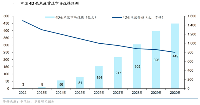 华泰研究则认为,预计2022-2030年中国新能源汽车销量的CAGR为20%;整体汽车销量的CAGR为2%,维持低个位数增长。同时,乘用车L2级辅助驾驶将成为标配,L2级别智能驾驶渗透率将由2021年的28.4%上升至2030年的59.9%,L3及以上级别智能驾驶取得一定的突破。受汽车智能化趋势的影响,2030年中国4D毫米波雷达市场规模有望达到449亿元。