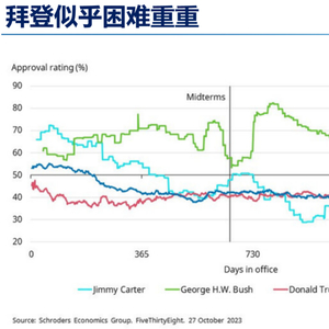 上图列举了三位连任失败的时任总统吉米·卡特、乔治·布什、唐纳德·特朗普和现任总统乔·拜登在自己第一个任期内民众支持率的整体表现。目前拜登所处的位置应该说并不乐观,拜登的整体支持率近期也只维持在不到40%或40%上下水平,跟三位只当选一任的前任总统们水平相当,似乎前路困难重重。