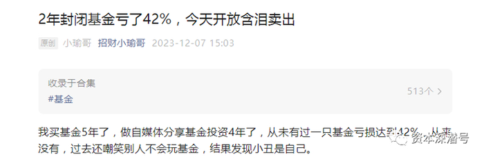 他在12月7号的视频和公众号文字里,曾经详述了自己买入一个封闭两年期的基金,到期亏损超过42%,又抛售的过程。