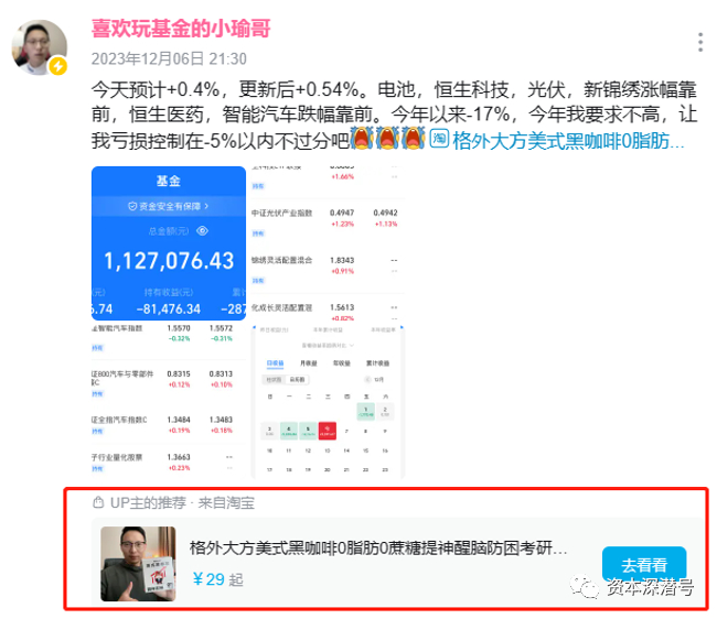 12月6日午间,B站up主“喜欢玩基金的小瑜哥”发布动态