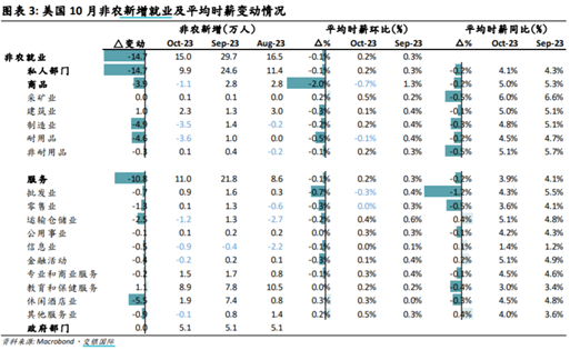 就业新增集中在医疗保健(+5.8万人)、政府部门(+5.1万人,并恢复至疫情前水平)、以及建筑业(+2.3万人)。汽车行业大罢工影响显现,制造业部门减少就业3.5万人,其中3.3万人来自汽车行业罢工。