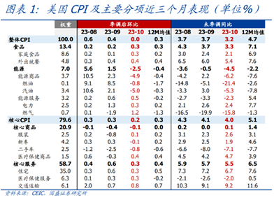 美国10月CPI同比+3.2%,低于预期的3.3%,前值3.7%;核心CPI同比+4%,低于预期的4.1%,前值4.1%。美国通胀不及预期,主要受到能源价格由涨转跌、房租重新降温和二手车价格继续下跌等影响。