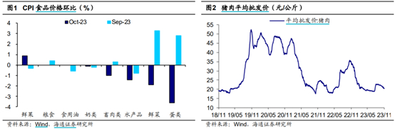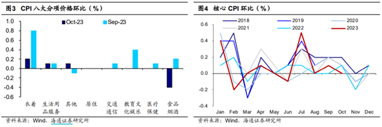 通胀:国内10月CPI同比-0.2%,不及预期的-0.1%,前值0%,再次陷入通缩;CPI环比-0.1%,前值0.2%。主要受食品项,其中猪价环比-2%,同比跌幅扩大到-30%,Q4生猪供给仍比较充裕,预期猪价低位震荡,但去年10月是猪价高点,往后基数效应压力减小;鲜菜、蛋类环比分别-1.9%、-3.6%,但相对生产周期较短。油价高位震荡,带动交通燃料环比+1.8%,同比有负转正至+1.8%。判断国内通胀不具备长期通缩的基础。