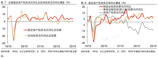 10月国内经济延续弱复苏,工业生产、消费好于预期,投资、出口、社融、物价均不及预期,制造业投资、基建投资保持相对稳定,地产投资跌幅仍在扩大,地产销售、新开工、施工、竣工等都不见起色。近期看到特别国债的出台、地产白名单融资支持、旧城改造等措施,政府稳增长政策在持续出台。