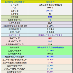 宝信软件 2001年6月14日由上海钢管股份有限公司更名为上海宝信软件股份有限公司。更名以来22.5年的光阴里,市值由52亿走至当前的1085亿。市值年均复利增长率为14.47%,复权股价年化回报率为12.99%,同期上证指数年化回报率为 1.33%。