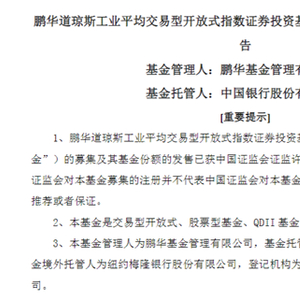 12月25日,鹏华基金旗下的道琼斯ETF正式发行。份额发售公告显示,道琼斯ETF募集期为2023年12月25日—2024年1月12日,募集规模上限为20亿元。据悉,道琼斯ETF上市后将跟踪道指,选取了美国最具代表性的30家大型上市公司作为成分股,通过价格加权编制而成。