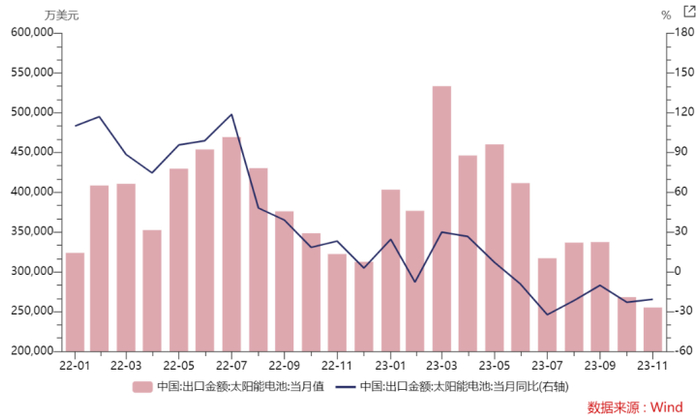 需求侧,根据国家能源局数据,11月国内光伏新增装机为21.32GW,同比+185%,环比+57%;1-11月国内光伏累计装机163.88GW,同比+149%。在国内光伏新增装机连续三个月环比下降后,由于国内年底通常会迎来抢装,因此11月装机数据明显修复,预计12月国内光伏数据将继续环比提高。
