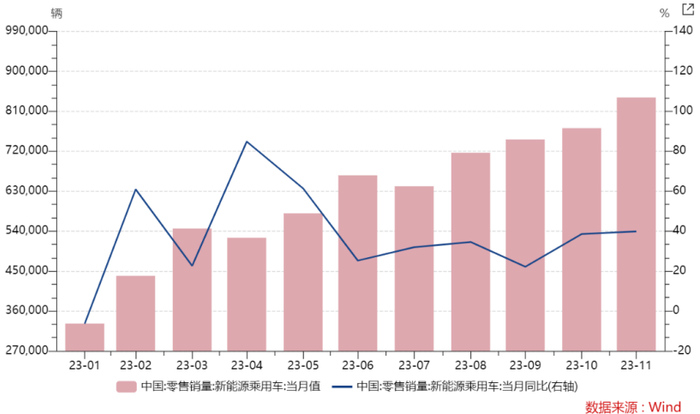 新能源车方面,根据乘联会公布的11月全国乘用车的销量情况,11月狭义乘用车终端零售207.9万辆,同比增长25.9%,环比增长2.4%。其中新能源乘用车销量84.1万辆,同比增长39.8%,环比增长8.9%,渗透率突破40%。根据中国汽车动力电池产业创新联盟的数据,今年11月中国动力电池累计装车量为44.9GWh,同比增长31%。