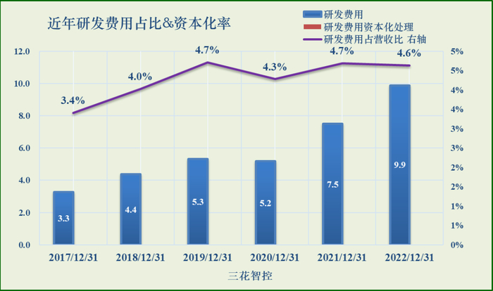 近年研发费用(资本化处理)、研发占营收比图