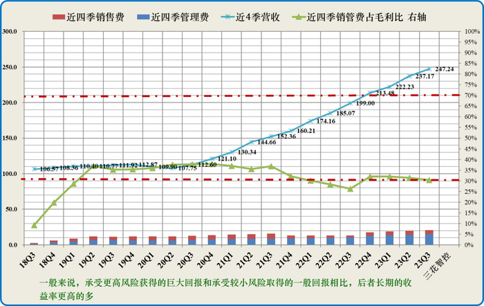 可关注近四季销售和管理费用与毛利润之比持续小于30%的公司,这样的具备较高的竞争优势(即图中绿线折线低于下红虚线为优异,靠近为优秀);若该指标处于30-70%之间(图中红色虚直线之间)为可接受区域;若大于70%需要警惕,说明该公司产生净利润的能力较弱。