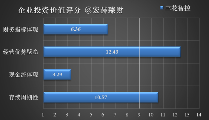 宏赫臻财上市公司投资价值评分涉及下图四大项评测,其中财务指标和现金流体现为纯定量分析评分;经营优势壁垒和存续周期性为定性分析量化得分,打分标准具体涉及企业①业绩增长②盈利能力③经营周期④现金流⑤竞争优势(护城河)⑥价值存续期⑦企业文化和管理等七项内容,详见=>【宏赫臻财投资价值评分体系说明】