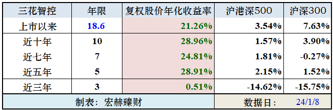 公司上市以来,近十年、近七年、近五年的复权股价年化收益率与同期有效参照规模指数对照如下表: