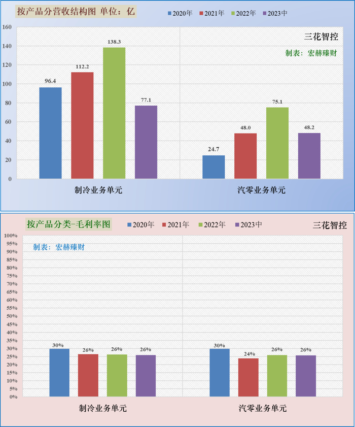 第一主营业务制冷业务单元占营收比权重为62%,近三年同比增幅分别为:0%、16%、23%;去年末毛利率26%。