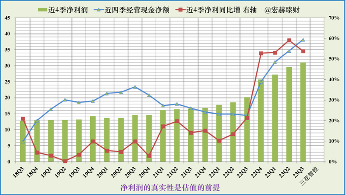 蓝色折线持续在绿色柱图上边及以上,显示净利润含金量高。