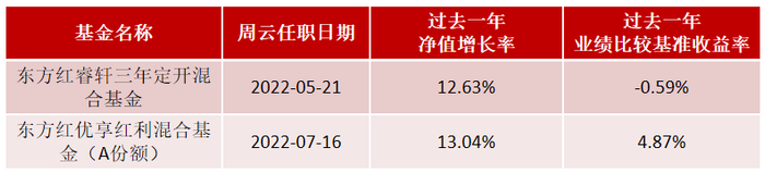 注2:基金份额仅列示A份额,数据来源基金2023年三季报。因截至2023.09.30,周云管理东方红智华三年持有混合基金和东方红鼎元3个月定开混合基金不足6个月,故未列示业绩。根据基金历年年报,东方红睿轩三年定开混合基金自2019年4月24日转型至2019年底份额净值增长率为17.28%,业绩比较基准收益率为0.70%,2020至2022年份额净值增长率分别为36.59%、-9.23%和-17.44%,业绩比较基准收益率分别为 15.43%、-5.21%和 -15.83%。业绩比较基准为:沪深300指数收益率× 60% +恒生指数收益率×20% +中国债券总指数收益率×20%。基金经理:刚登峰(2016.01.20至2022.05.20)、周云(2022.05.21至今)。东方红优享红利混合基金A份额2018至2022年份额净值增长率分别为-24.62%、51.26%、43.69%、-7.34%和-17.40%,业绩比较基准收益率分别为-13.16%、11.75%、1.97%、5.54%和-5.69%。业绩比较基准为:中证红利指数收益率×60% +恒生指数收益率× 20% +中国债券总指数收益率×20%。基金经理:刚登峰(2016.10.31至2022.07.15)、周云(2022.07.16至今)。