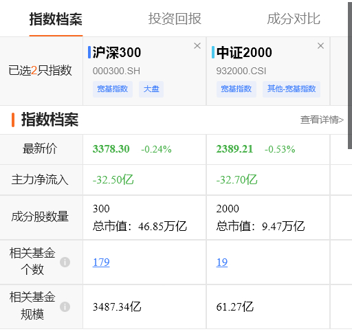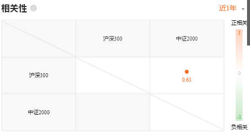 指数对比功能最多可以实现5个指数的对比,我们拿沪深300和中证2000来进行对比,可以看到其最新价、总市值、相关基金个数等多方面信息,更重要的是,两大指数的相关性数据也给我们列出来了,沪深300与中证2000的相关系数为0.61,正相关但不算太强,我们在做资产配置时,就是需要关注资产的相关性,如果太相近,账户可能会出现齐涨齐跌的情况,相关性呈现负数,则体现出配置的多样性,风险相对分散,安全一些。当然,其中还有很多数据我们都可以查看。