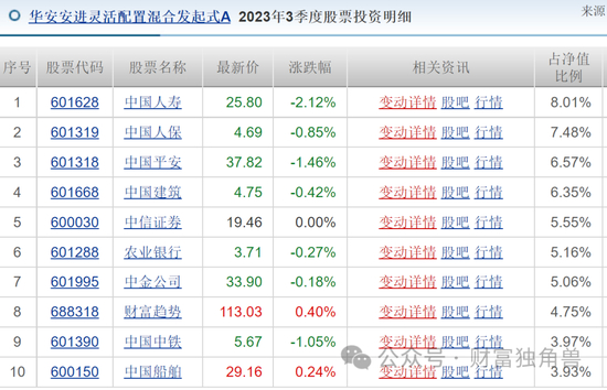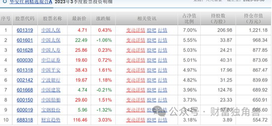 2023年3季度该基金的持股风格大变,全部换成中字头的股票,其中中国人保位列首位持股206.98万股(2023年7月1日-2024年1月10日股价下跌了17%)。同一时间段,该基金也买进了中国太保(位列前十大重仓股第二位持股33.81万股)。