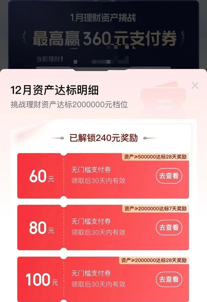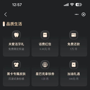 (1)支X宝:100万持仓以上客户给财富黑卡V3,每年有2次豪车接送你,8.8元话费红包,每月一杯星巴克拿铁、+100元加油券,还有快速登机各种福利;