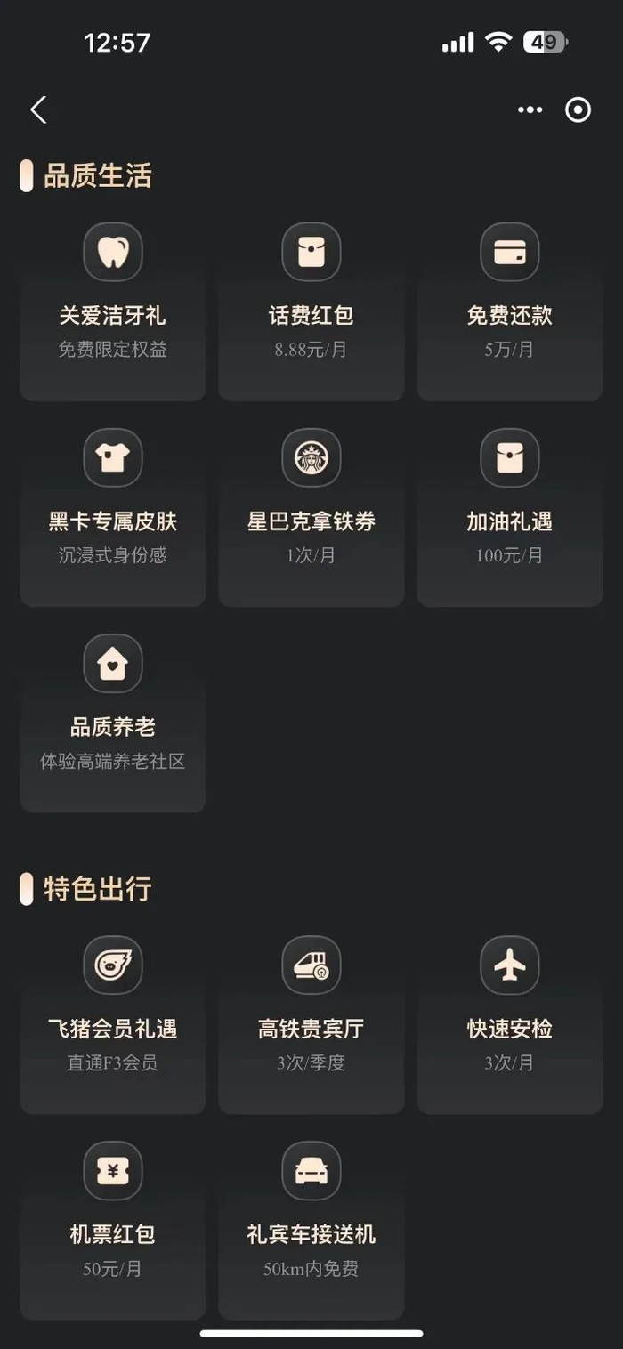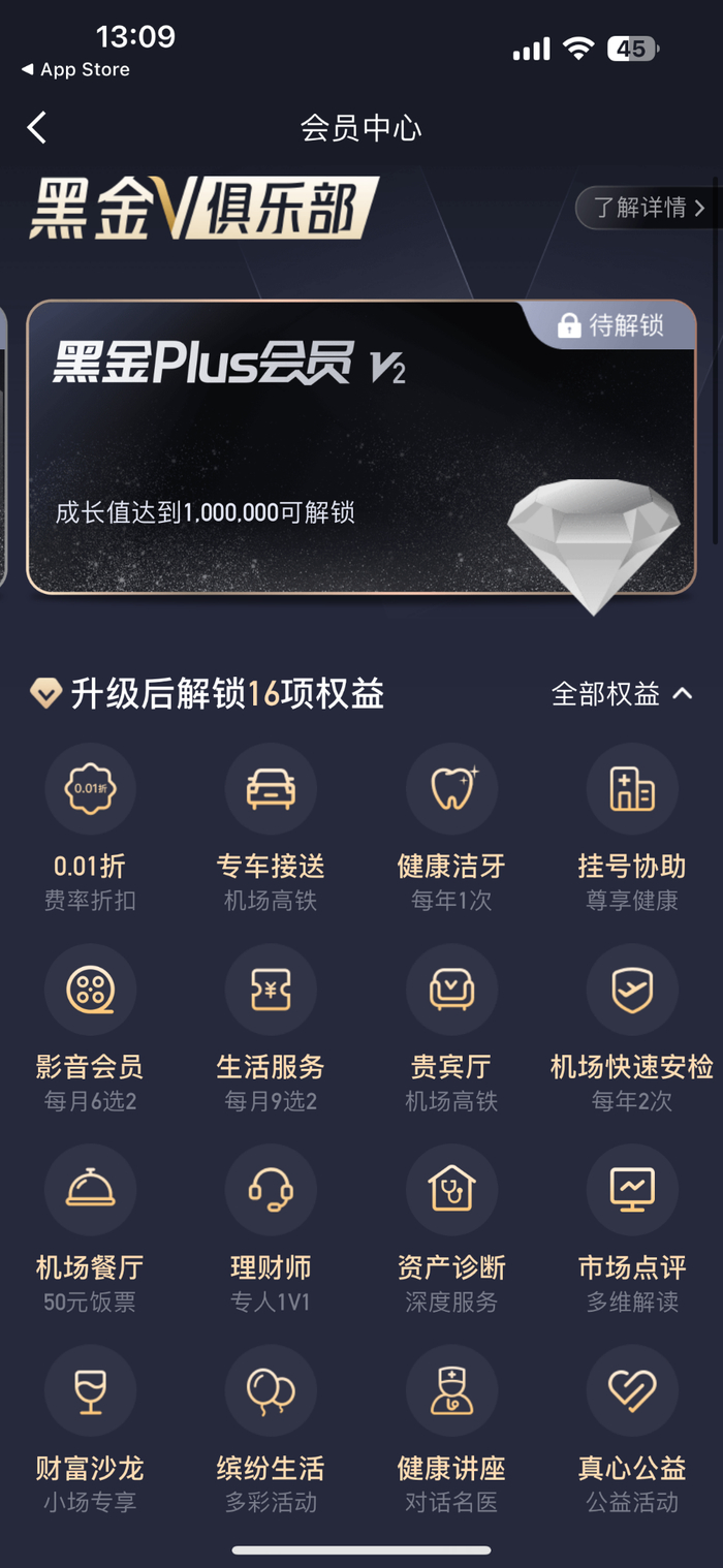 其最高挡位的黑金会员也有申购0.01折扣(约等于没有),机场专车、快速安检、协助挂号等权益。