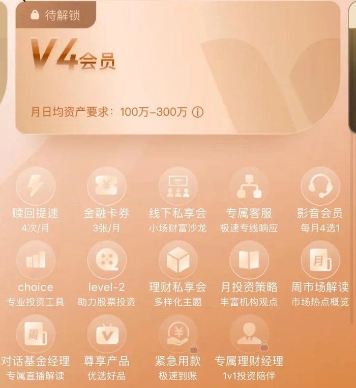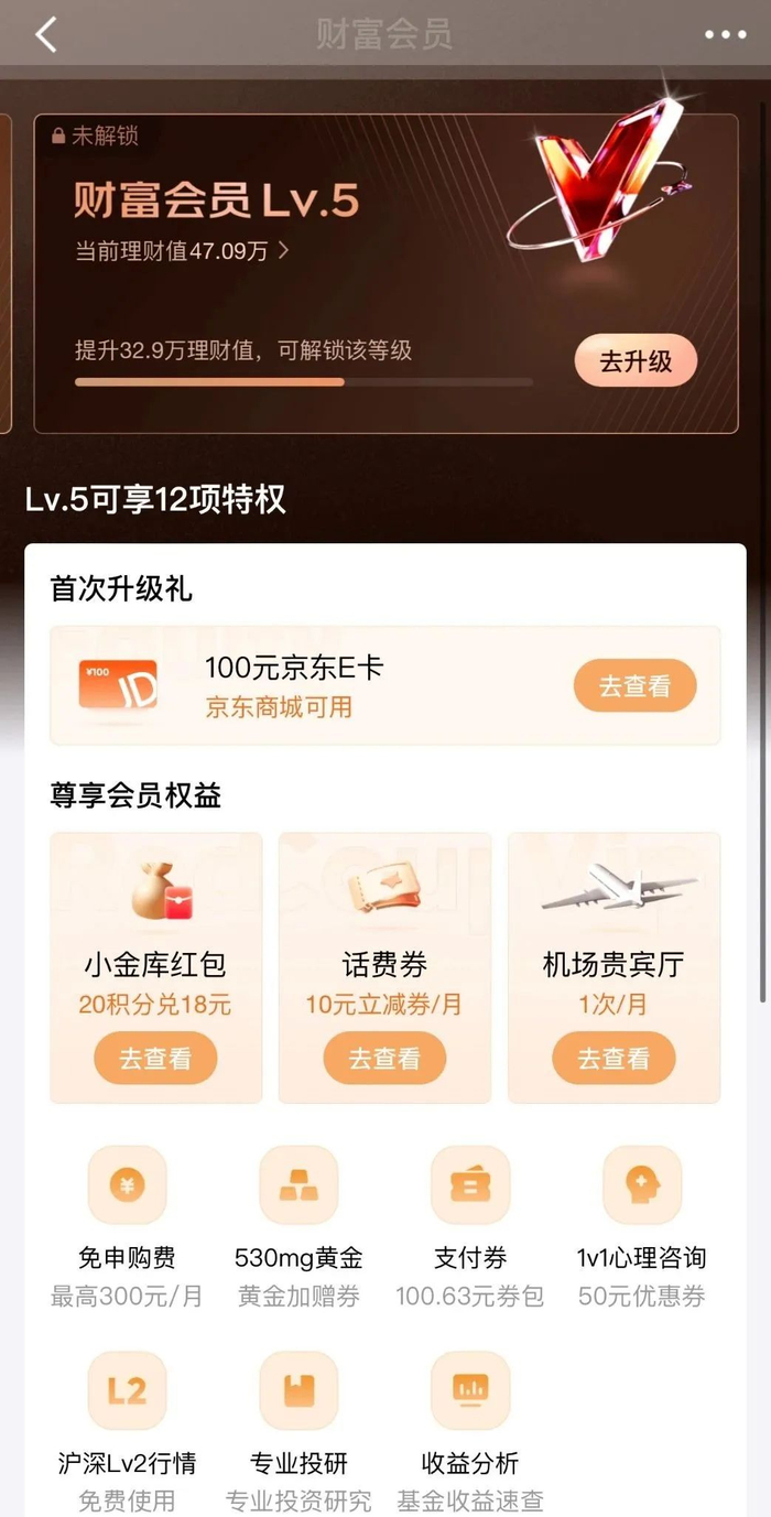 如果是V5等级(80万以上)持仓,除了买基金免申购费(300元上限)之外,每个月还有如下优惠: