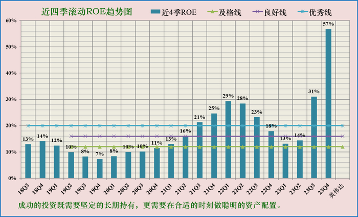 上图观察公司净资产回报率ROE的周期走势。ROE由低至高走上20%+为优,或稳健保持20%+为优。