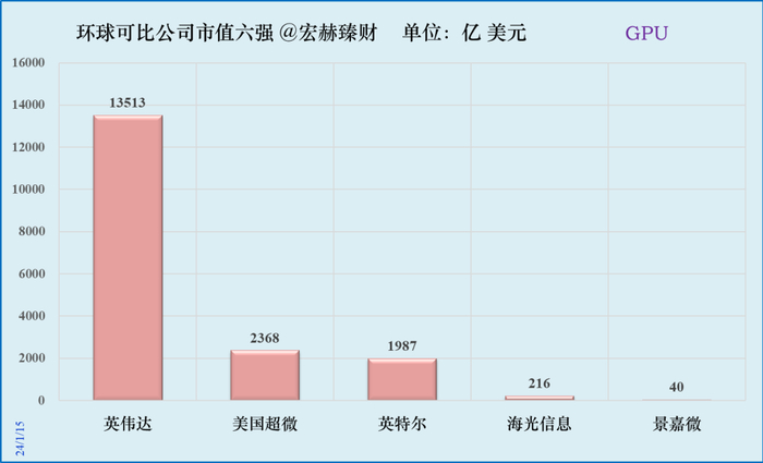 参照行业为“GPU”的当前可比公司共计5家,当前时点该行业市值最高为英伟达,市值1.35万亿美元。