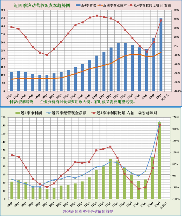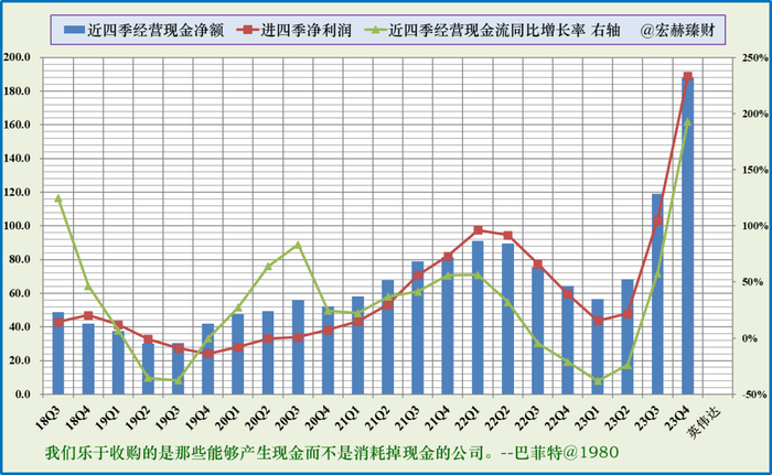 蓝色折线持续在绿色柱图上边及以上,显示净利润含金量高。