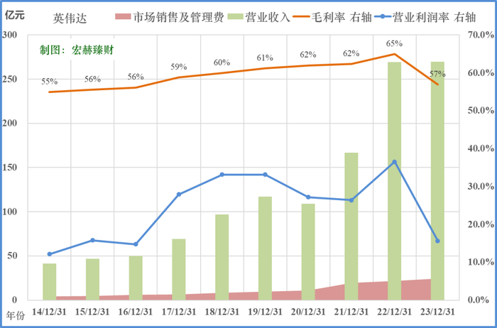 观察市场、销售和管理费用和营收的柱图对比;观察毛利率、营业利润率的绝对值和趋势。