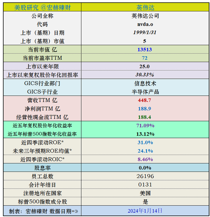 英伟达 当前近四季度营收为449亿,归母净利润189亿,当前市值13513亿,市盈率72倍。