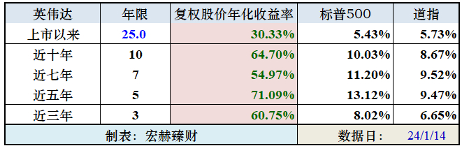 公司在美股上市日期为1999年1月22日,上述统计有数据的基期为1999年1月31日,基期以来25.0年的光阴里,市值由5亿美元走至当前的1.35万亿美元。市值年均复利增长率为约36.70%,复权股价年化回报率约为30.33%,同期标普500指数年化回报率为 5.43%。