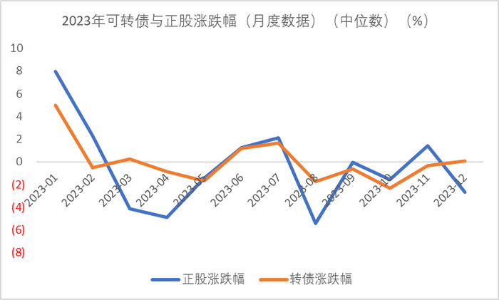 以2023年为例,逐月计算可转债及其正股涨跌幅中位数,可以看出在市场震荡时,可转债明显具有更好的抗跌性: