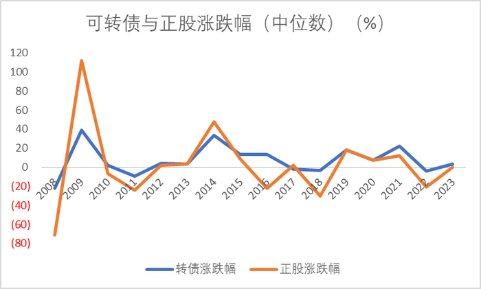 从历史上每年的正股和转债涨跌幅(中位数)统计来看: