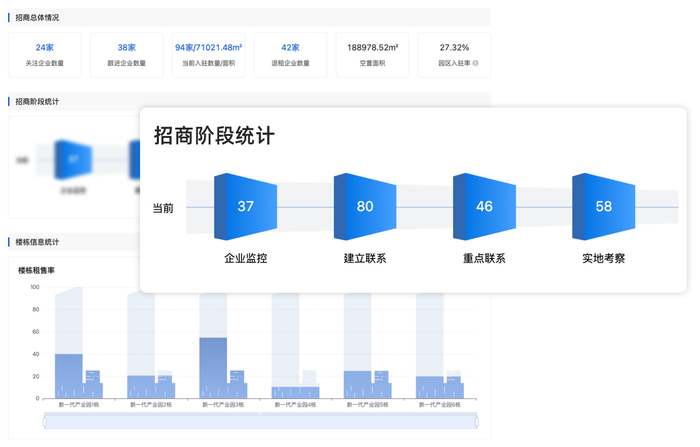 召募3.0还提供运营系统配置工作模块,对各个园区的信息实现系统化的管理,并可生成招商报告、招商人员绩效数据统计等展示文档。
