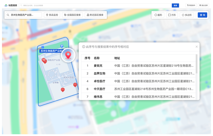 在地图搜索功能模块中,从业人员可根据实际招商需求,以地图搜索的方式实时展现目标地区企业动态。