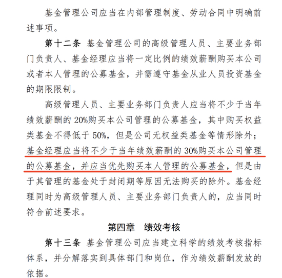 其中,基金经理应当将不少于当年绩效薪酬的30%购买本公司管理的公募基金,并应当优先购买本人管理的公募基金。